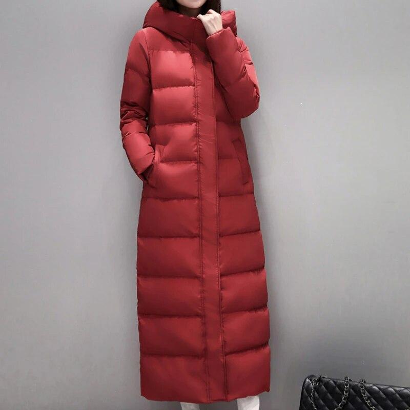 Damen Winter Warm Extra Lang Daunenmantel Winter Daunenmantel Dicker Mantel Schwarz Rot Kapuze Rei?verschluss Warm Fashion Outer